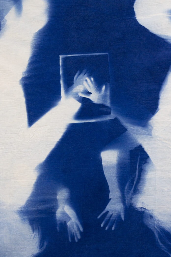 7m×2mの大きな布に、太陽の光によって滲むように焼き付けられた人影の作品。その前で、舞踏家・今貂子による舞踏パフォーマンスが行われる。 静と動、光と影。 生身の身体と、作品の中に残された人の痕跡が同一の場に立ち現れ、写真と舞踏が交差する構成となっている。 「今、ここ」に存在する身体と影、そして布に刻まれた時間の層との関係のあいだで、 観る者は両者に生じる重なりを体感する。 その体験を通して、身体の存在や記憶の在り方、可視と不可視の境界に目を向け、 私たちを無意識に縛ってきた概念や時間から、ひととき解き放たれる場となることを目指す。
