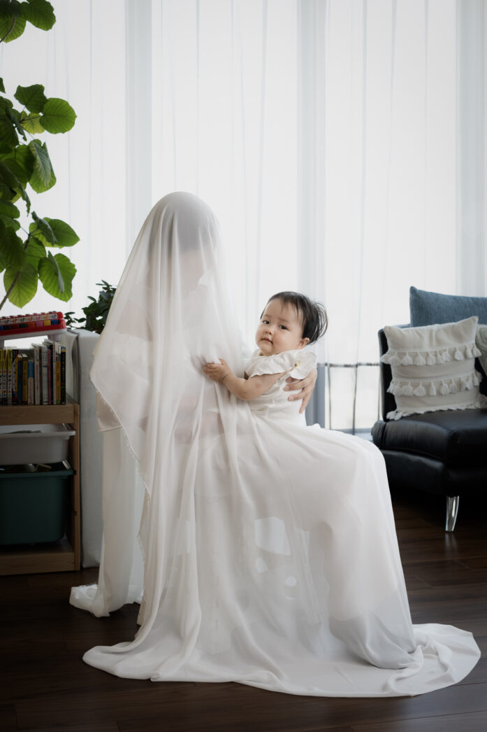 ヴィクトリア朝時代に乳幼児を撮影する際、母親たちはシーツやカーテンの裏に身を隠し、長時間露光の間、我が子を動かないように支えていたという。子どもに光が当たるその瞬間、母たちは息をひそめ自らの存在を影へと退けていた。この匿名化された母の姿は、まさに現代の日本社会が理想とする母親像を象徴しているかのようである。