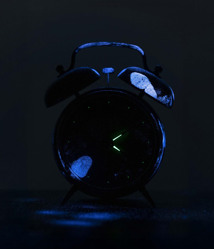 警察の鑑識で使用される特殊な粉を被写体に振りかけ、その表面に残された「痕跡」を可視化して撮影する。写真の中に浮かび上がる朧げでありながら微光を放つ像は、普段は目に見えない「永い沈黙の末に結晶した、触知の澱(おり)」を映し出します。