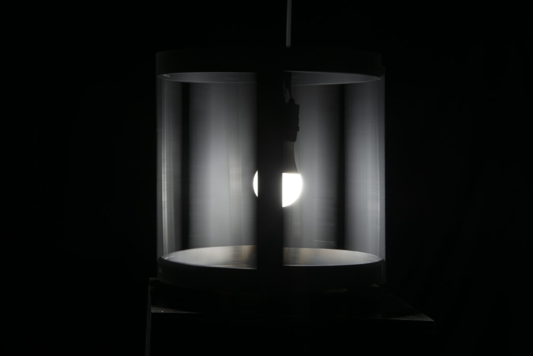 黒田零は、この場に「循環」と「脱人間中心主義」をテーマとする写真・映像作品を展示する。明確に輪郭づけられた世界ではなく、闇の中で他の存在と溶け合い、形を変え続ける〈影〉の世界に眼差しを向けている。薄暗い空間に回転するランプシェードと、注意深く見なければ判別できない写真が配置され、鑑賞者は映像を「見る」のではなく、まるでスクリーンの内部や胎内に入り込むような感覚へと導かれる。