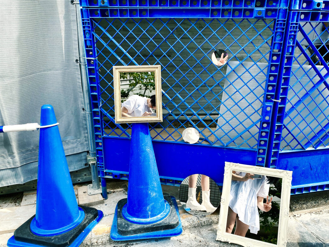 本作では、その媒介として鏡を用いた。鏡は、私たちの日常と密接に結びつき、「他者から見えている自分」を確認する装置である。その機能性を拡張し、街中に鏡を配置することで、鏡に映る自己と鏡の外に広がる風景を同一フレームに重ねていく。制作には、現代において最も身近で簡略化されたメディアであるスマートフォンを使用し、「自撮り」という最小単位の写真行為へと表現を削ぎ落とした。本展《ミラーりんぐっ!》は、こうして生まれた「セルフミラーポートレート」により、撮影者と被写体の関係、そして「撮影者は写らない」という写真観そのものを問い直す試みである。