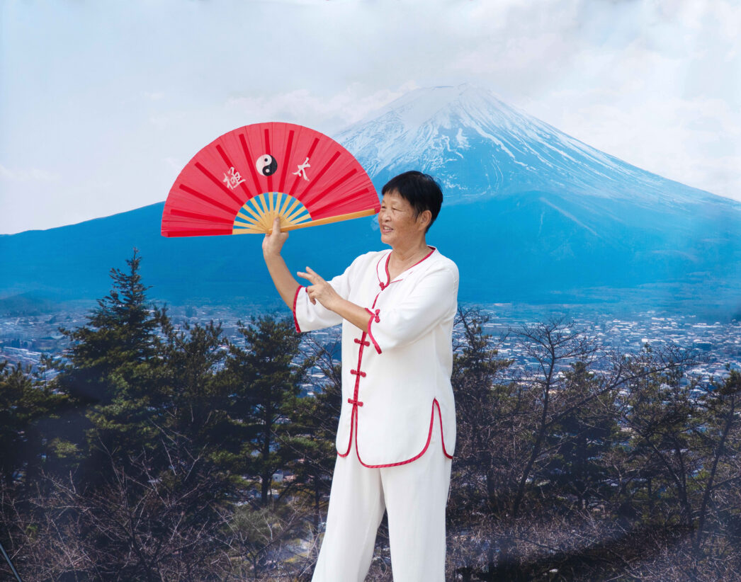 吴は、日本の象徴的な風景を撮影し、それらを巨大な幕布として印刷して中国へ持ち帰った。そして、その幕布の前に立つ中国の人々を撮影した。これらの風景は、日本という文化的文脈から切り離されることで、いったん意味を解体され、再構成される。もはや国家的文化の象徴としてではなく、平面化されたイメージとして、中国の環境のなかに置かれる存在となる。